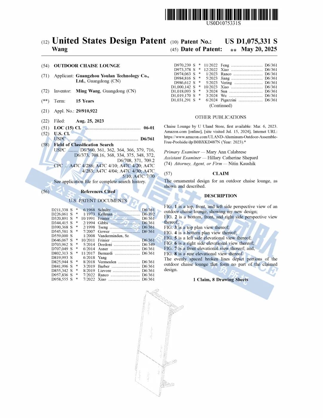 此案为专利维权,涉及一项美国外观专利,专利号:US D1075331 S,于2025年5月20日下证,跨境卖家一定要注意检索下架,未经授权不得擅自使用,以下是涉案专利的具体信息,可供卖家参考,避免TRO侵权损失!