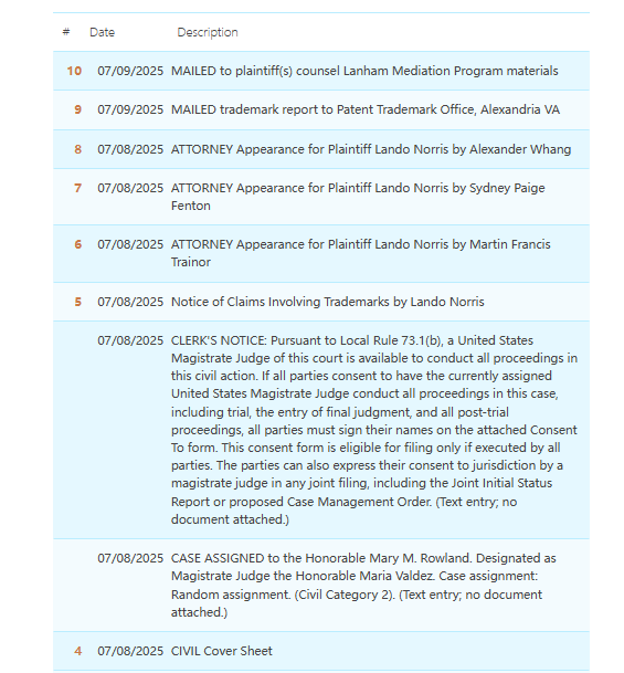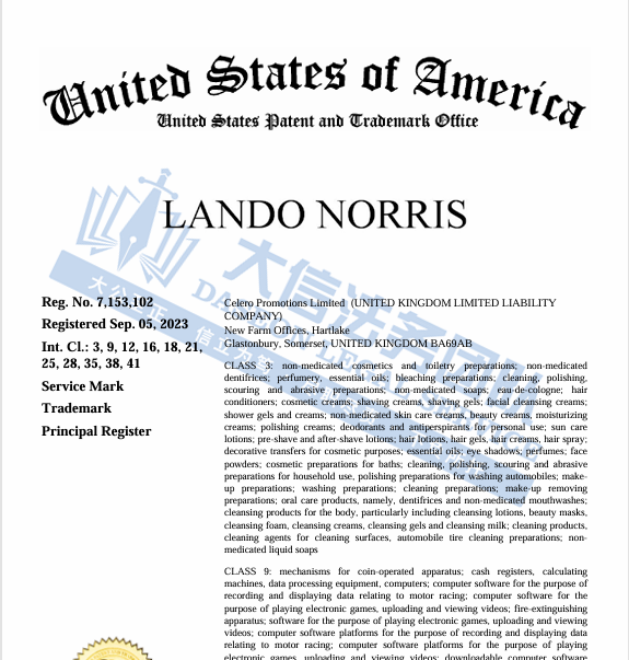 此案为商标维权,涉及2个商标,商标词:Lando Norris、Lando,跨境卖家一定要注意检索下架,未经授权不得擅自使用,以下是涉案商标的具体信息,可供卖家参考,避免TRO侵权损失!