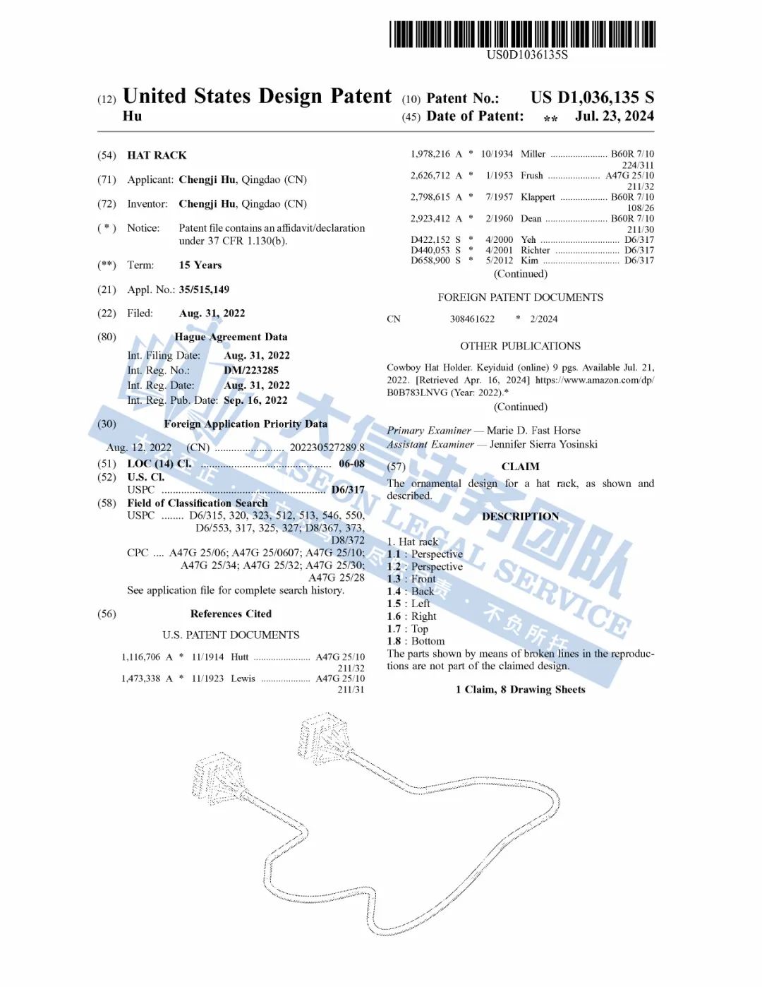 此案为专利维权,涉及一项美国外观专利,专利号为:D1036135,于2024年7月23日下证,跨境卖家一定要注意检索下架,未经授权不得擅自使用,以下是涉案专利的具体信息,可供卖家参考,避免TRO侵权损失!