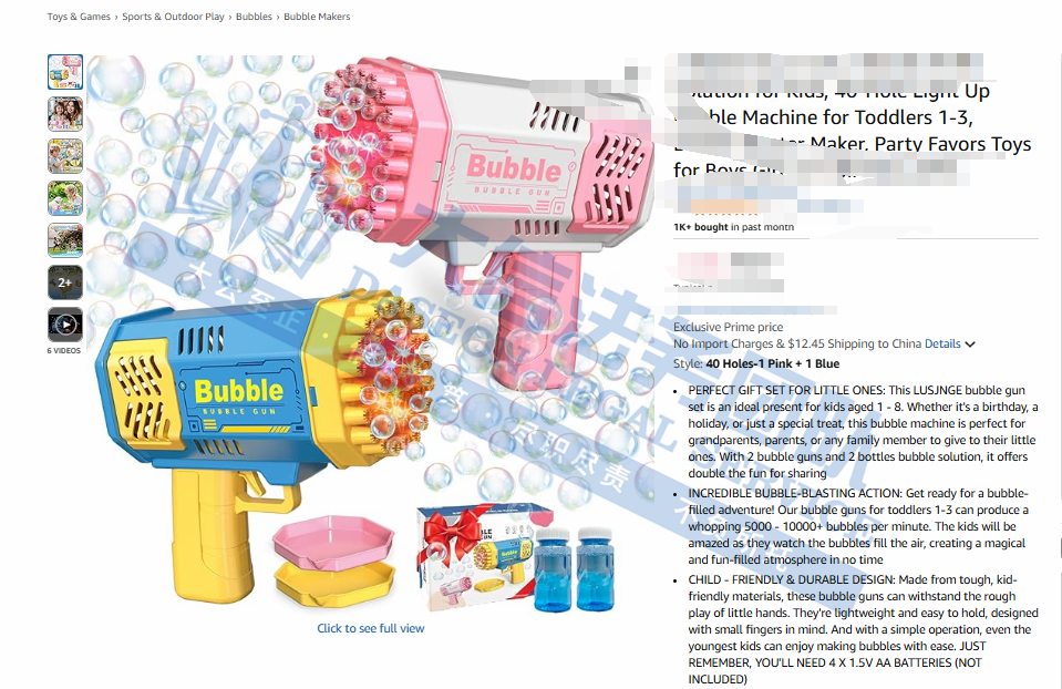 原告是来自广东的国人卖家,其下有一款核心产品为ROCKET BUBBLE自动泡泡枪,ROCKET BUBBLE(火箭泡泡枪)是一款主打“火箭筒”造型的自动电动泡泡枪,专为儿童户外游戏设计。它把科幻感与趣味性合二为一,版本有40孔或64孔出泡口,电机驱动,一键自动连续出泡,可形成“泡泡雨”或“火箭形泡泡云”,喷射距离远、覆盖面积大,户外派对、草坪、沙滩都能玩。