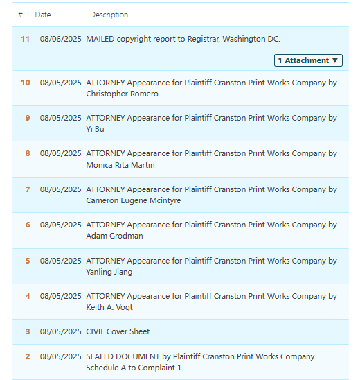 原告:Cranston Print Works Company