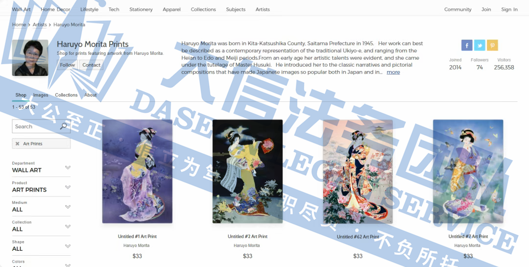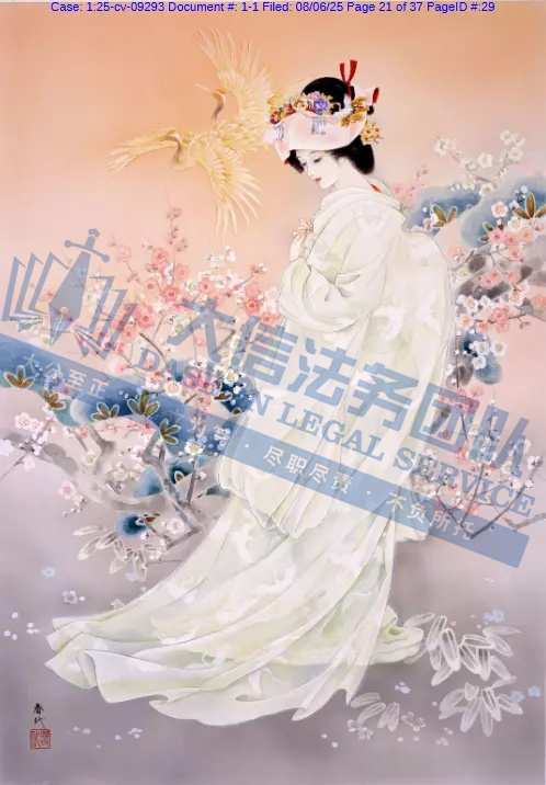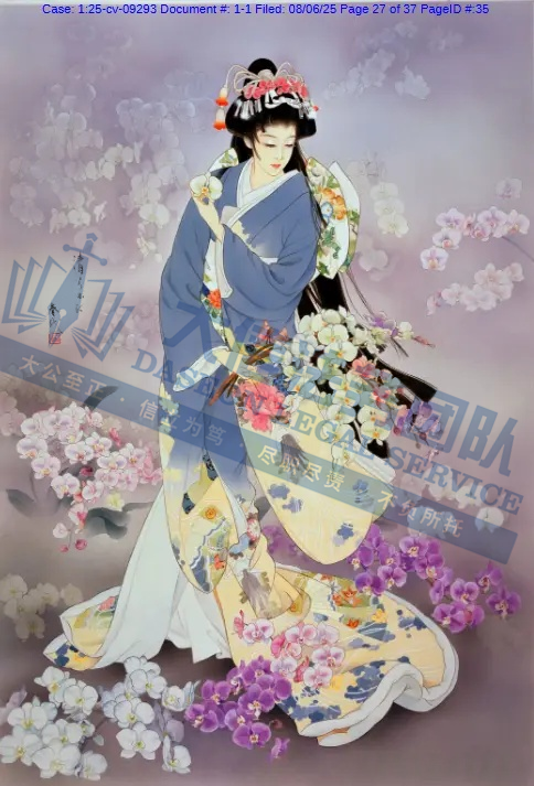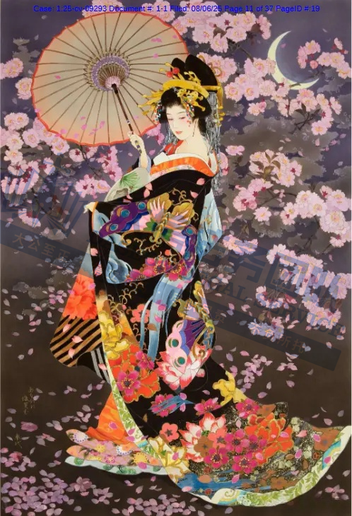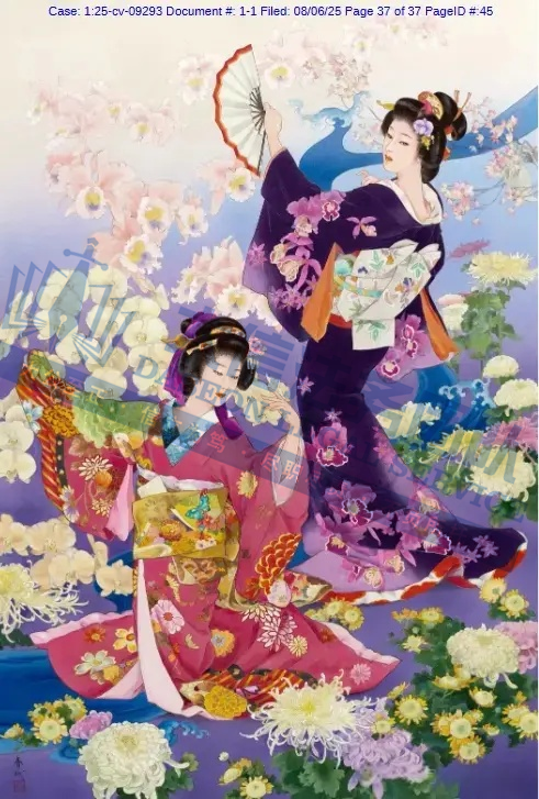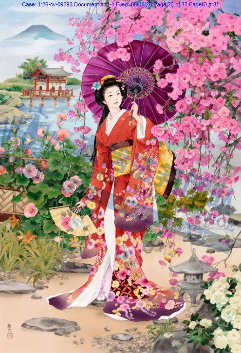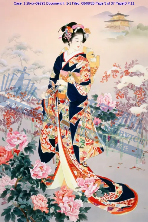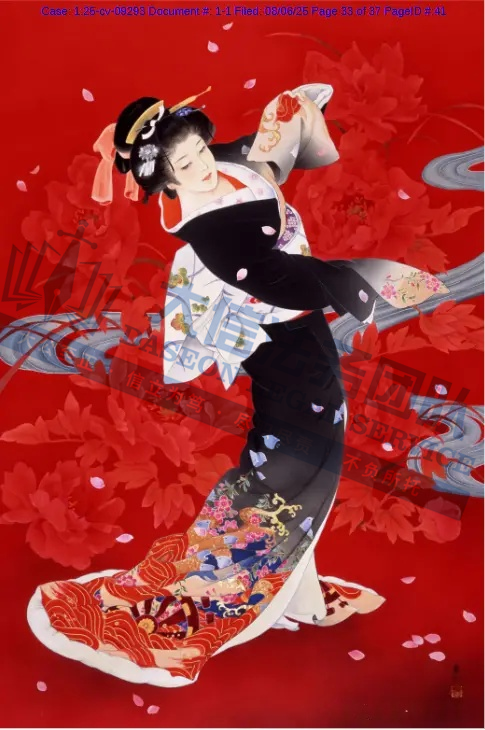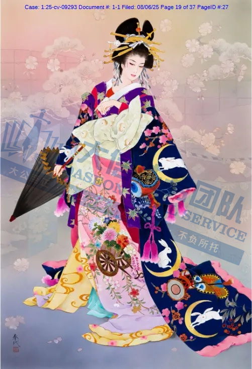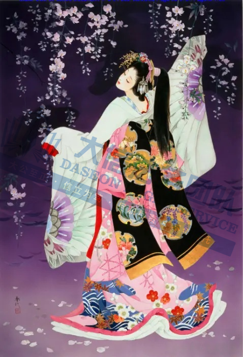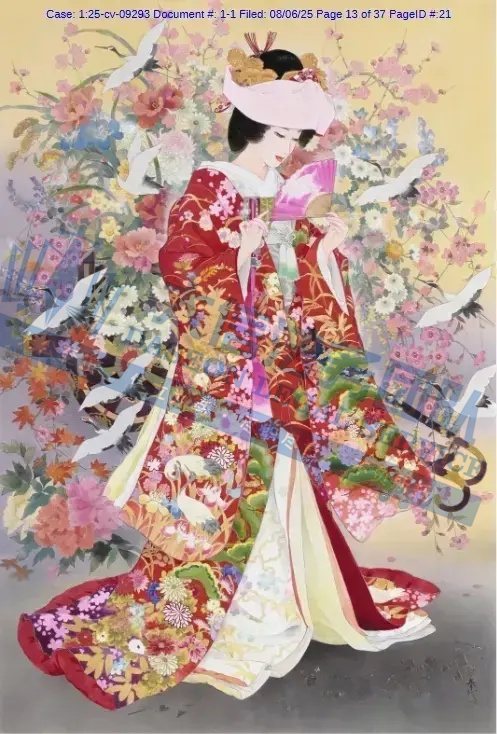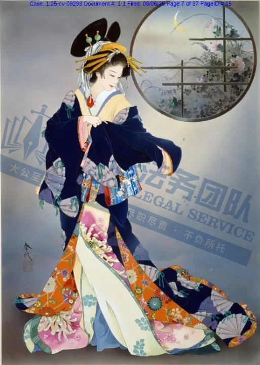 原告是一名拥有超过50年艺术生涯的日本艺术家,专注于描绘日本传统女性(如艺妓、舞妓、贵族女子),尤其注重和服的纹样、造型与细节,赋予人物“如樱花般柔美”的气质。凭借独特的跨文化风格,成为昭和时期代表性女画家之一。通过细腻笔触展现女性优雅姿态,色彩明丽且构图讲究。她曾与日本Epoch、西班牙Educa等品牌推出拼图产品。