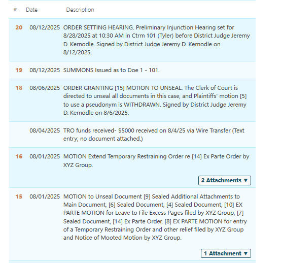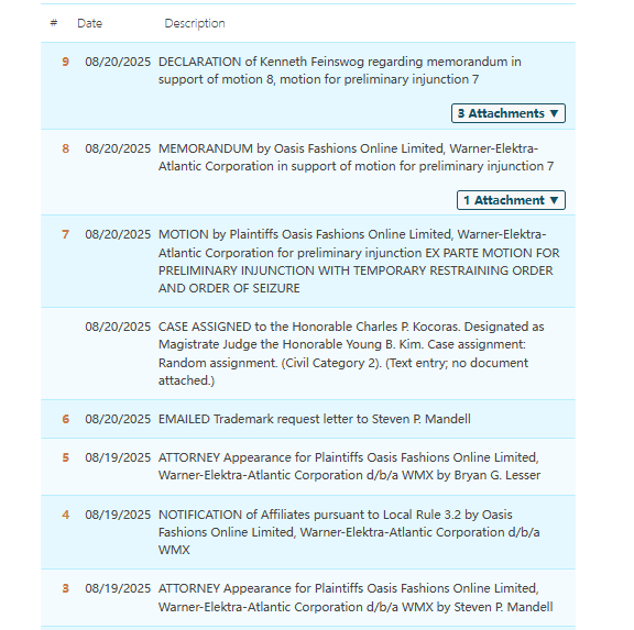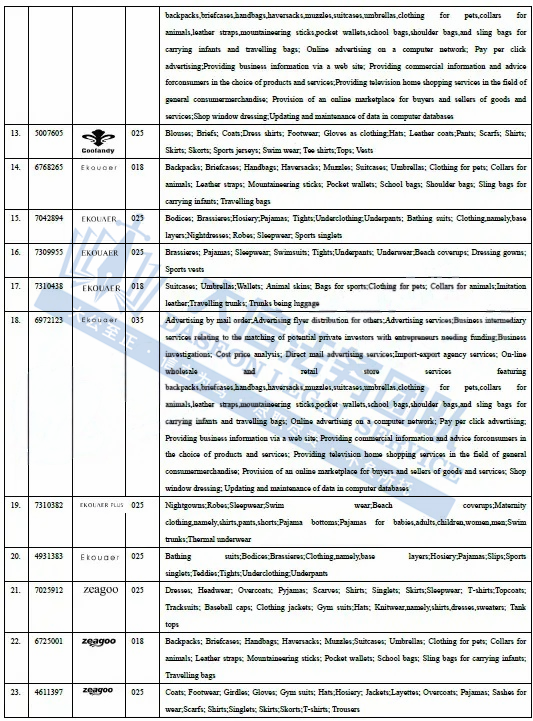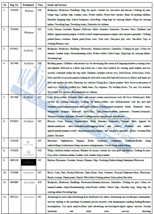 此案为商标维权,目前在Shein平台,已经冻结了101家店铺,注意原告在美国注册了50个商标,涉及ARSHINER、AVIDLOVE、COOFANDY、EKOUAER和ZEAGOO等,跨境卖家一定要注意检索下架,未经授权均不可擅自使用,侵权风险极高!以下是涉案商标信息,可供卖家参考,避免TRO侵权损失!