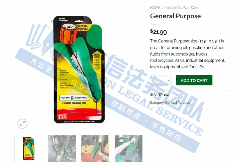 原告是一家源自美国德克萨斯州的实用工具制造商,旗下有一款核心品牌Form-A-Funnel是一款柔性排油工具,用于将油从小型到大型车辆、摩托车、飞机和重型设备引导到排油管中,以便轻松、无障碍地更换油。它可以轻松塑造形状,将难以排出的液体直接排入排水管,从而防止油和其他液体接触到用户、车辆和车间地板,适用各种难以到达的空间,能够轻松排出割草机的油,避免油液四处飞溅。