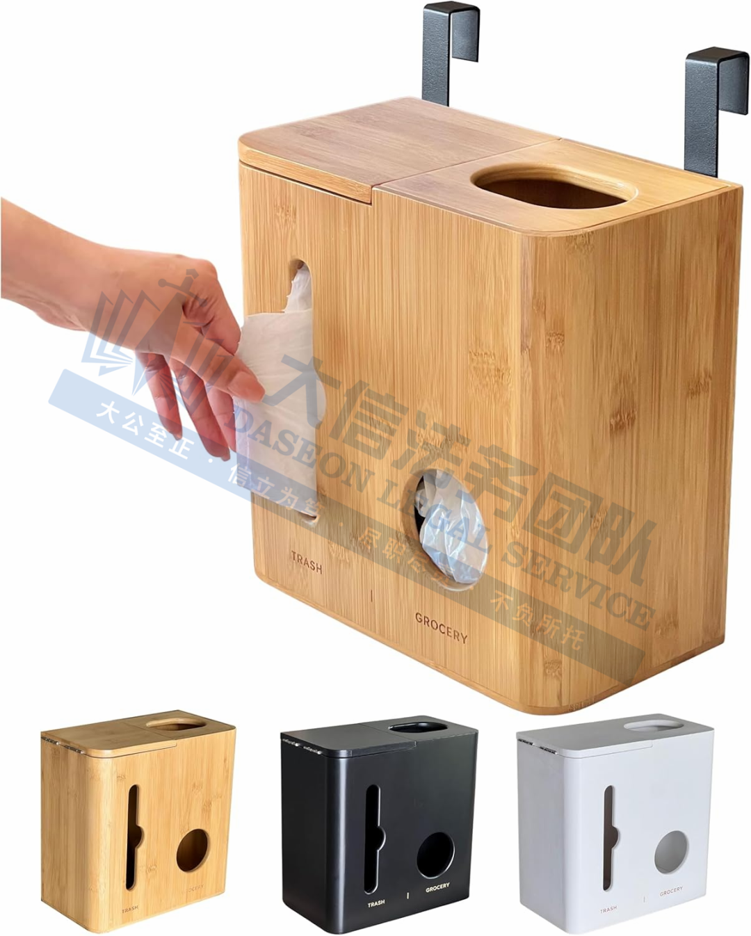 原告设计了一款简单实用的二合一垃圾袋收纳器,左边收纳食品袋,右边收纳垃圾袋,产品采用防割圆弧边缘,需要时可以轻松取出购物袋,确保安全的同时可防止袋子撕裂。适用于收纳食品杂货袋和垃圾袋。安装方式灵活,含挂钩可用于橱柜门上方或水槽下方,有内置壁挂硬件,也可独立放台面或作为食品储藏室收纳架。