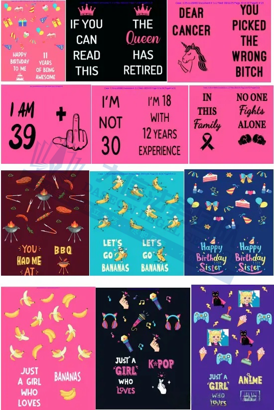 此案为版权维权,涉及8张版权图,版权号:VA 2-395- 439、VA 2-240-955、VA 2-420-957、VA 2-420-996、VA 2-420-999、VA 2-420-999、VA 2-420-999及Vau 1-516-564等,未经授权均不可擅自使用,侵权风险极高!以下是涉及版权具体信息,跨境卖家尽快检索下架,避免造成更大的侵权损失!