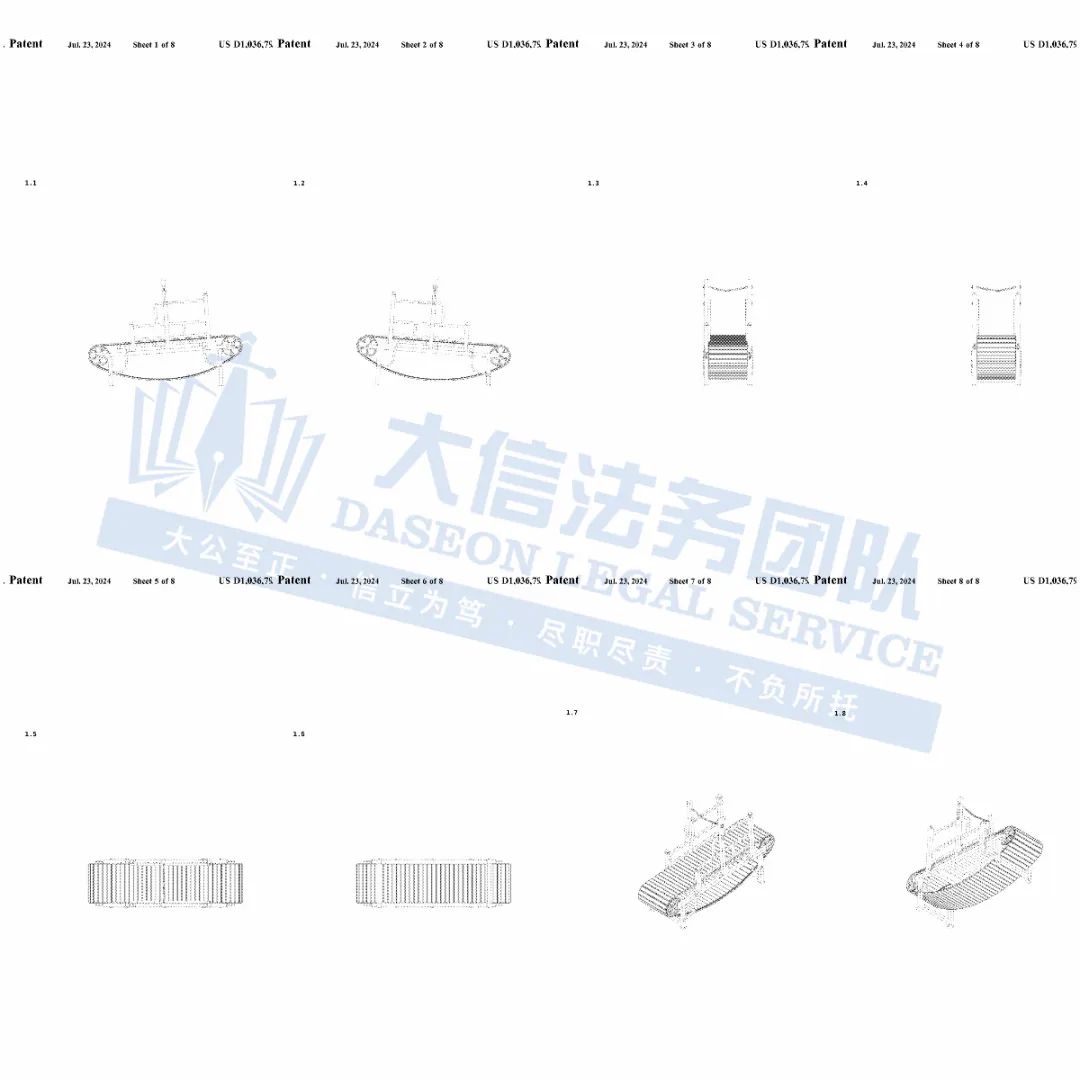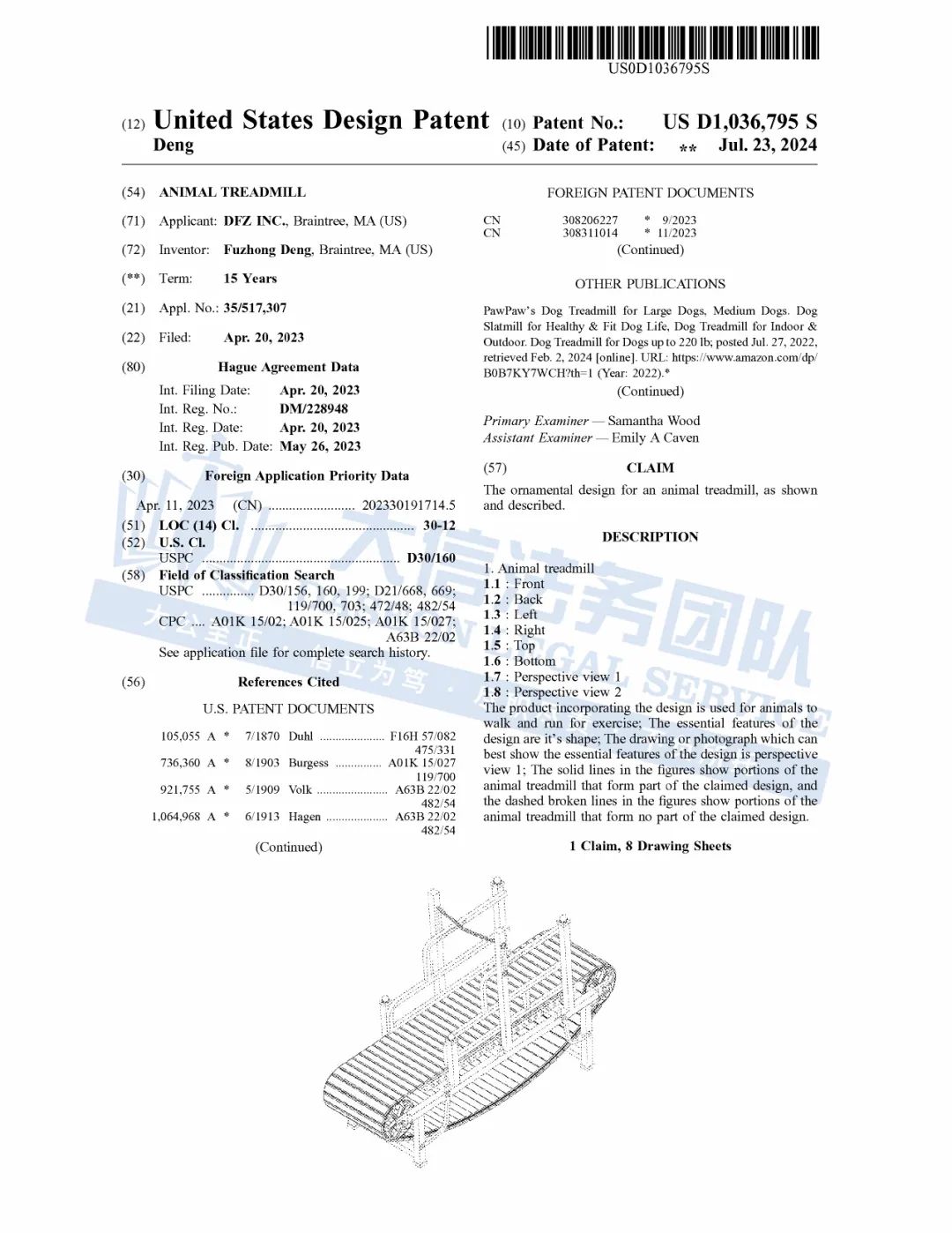 此案为专利维权,涉及两个外观专利,专利号:US D1053475S、US D1036795 S,主要涵盖动物跑步机和动物跑步机的皮带装置,以下是涉及专利的具体信息,未经授权均不可擅自使用,侵权风险极高!跨境卖家尽快检索下架,避免造成更大的侵权损失!