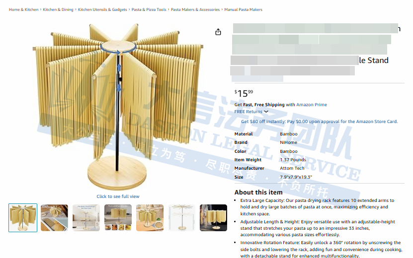 原告是来自山东的国人卖家,专注于木工工具的设计、制造及销售业务。旗下有一款针对面食爱好者设计了一款必备工具,面食干燥架,该产品由木材制成,可确保长期使用。其核心设计特征包括对称式框架、上宽下窄比例等整体造型,支撑条与底座的平滑过渡等细节设计,木质且外观符合特征的产品侵权风险更高。
