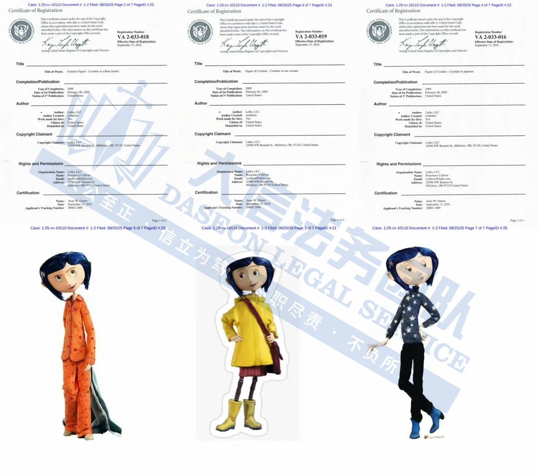 此案为商标+版权维权,涉及Coraline商标以及Coraline角色版权展开,涉案版权号为:VA 2-033-018、VA 2-033-016和VA 2-033-019,以下是涉及商标版权的具体信息,未经授权不得擅自使用,侵权风险极高!跨境卖家尽快检索下架,否则会有TRO侵权风险!
