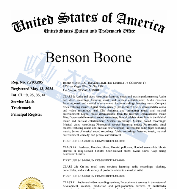 原告是一家专注于制造、分销艺人周边产品并拓展至艺术家品牌运营、活动策划及跨界合作领域的运营企业。Benson Boone 是近年来在欧美乐坛快速走红的创作型歌手,凭借真挚的嗓音和流行曲风,在年轻群体中积累了庞大粉丝基础。2024年凭借《Beautiful Things》登顶Billboard全球榜,获MTV EMAs“最佳新人”及格莱美提名。Benson Boone音乐融合民谣与流行元素,歌词聚焦情感共鸣,舞台以高难度后空翻为特色。
