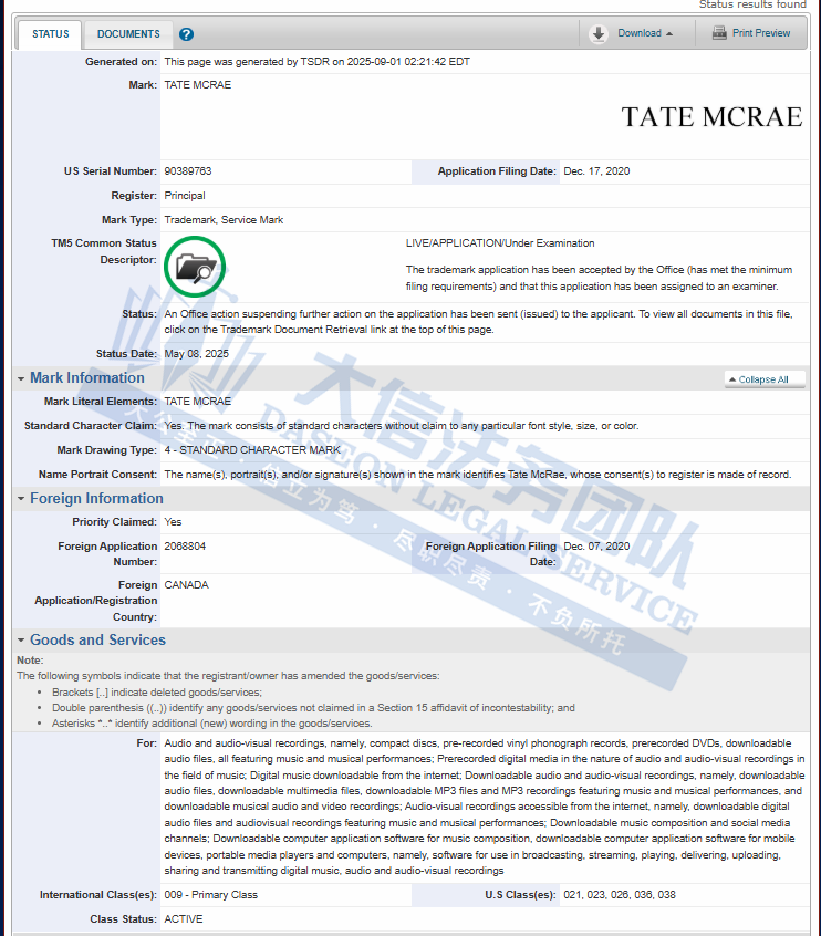 原告是一家专注于音乐与品牌周边商品开发的全球领先企业,ate McRae(泰特·麦克雷)是加拿大新生代流行歌手、舞者及演员,以其出色的唱跳实力和多元风格在欧美乐坛崭露头角,2023年单曲《Greedy》登顶美国公告牌百强单曲榜第3名,成为首支全球冠军单曲,融合流行与R&B元素,探讨亲密关系。2025年第三张专辑《So Close to What》登顶美国公告牌200强专辑榜,收录15首曲目,风格多元,获朱诺奖多项大奖。被粉丝称为“Z世代的布兰妮”,致敬偶像的同时保持独立风格,通过音乐传递成长感悟与情感共鸣,成为年轻一代的文化符号。