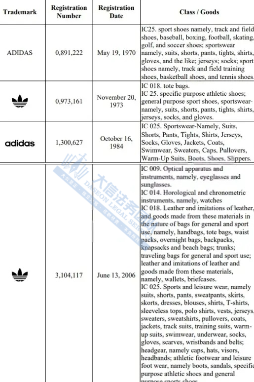 此案为商标维权,主要涉及商标信息:adidas文字商标,三叶草与三条斜杠的图形商标,侵权风险极高!以下是涉及案件具体信息,未经授权不得擅自使用,跨境卖家尽快检索下架,避免TRO侵权风险