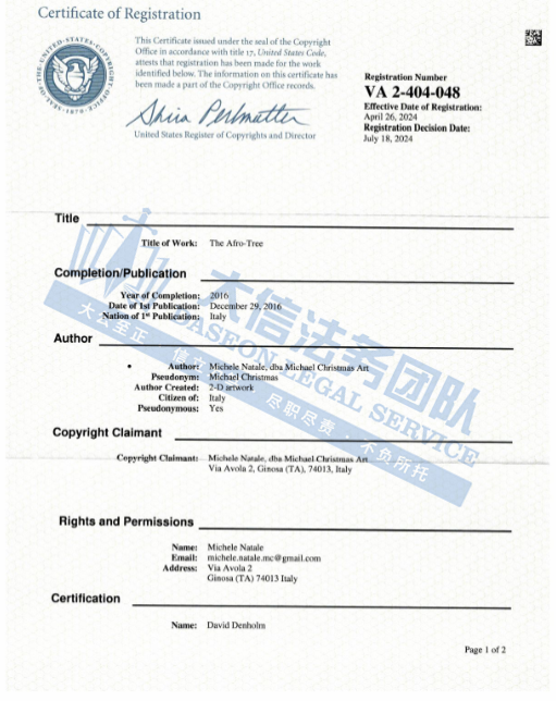 此案为版权维权,涉及1幅非洲树黑人女孩版权,涉案版权号为:VA 2-404-048,于2024年4月26日下证,以下是涉及版权具体信息,未经授权不得擅自使用,侵权风险极高,跨境卖家尤其是服装卖家尽快检索下架,避免TRO侵权风险!
