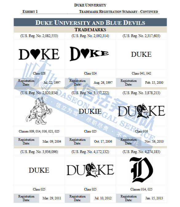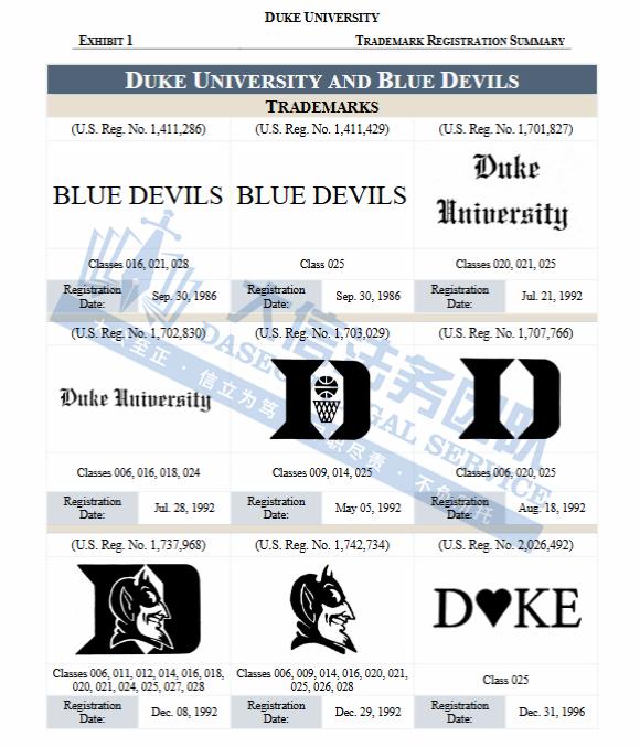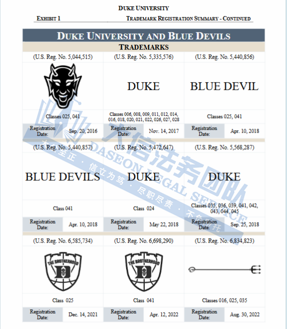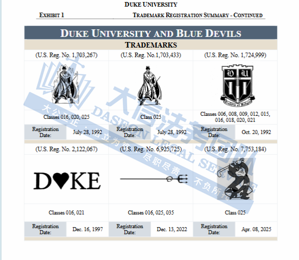 此案为商标维权,涉及原告注册的多个文字商标以及图形商标展开的维权,“BLUE DEVILS”系列、“DUKE”系列,还有像“三叉戟 +字母 D”这种特色设计商标,涵盖T恤、服装、装饰品、玩具、文具、珠宝及配饰等多个领域,以下是涉及商标具体信息,未经授权不得擅自使用,侵权风险极高,跨境卖家尤其是服装卖家尽快检索下架,避免TRO侵权风险!