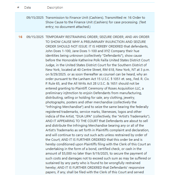 此案为商标维权,主要针对Dua Lipa商标维权,涵盖香水、录音制品、纸制品、金属与珠宝、箱包、服饰、娱乐等多个类目。以下是涉及商标具体信息,未经授权不得擅自使用,侵权风险极高,跨境卖家尤其是服装卖家尽快检索下架,避免TRO侵权风险!