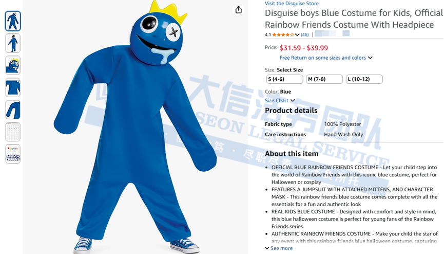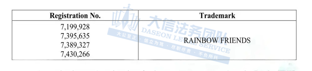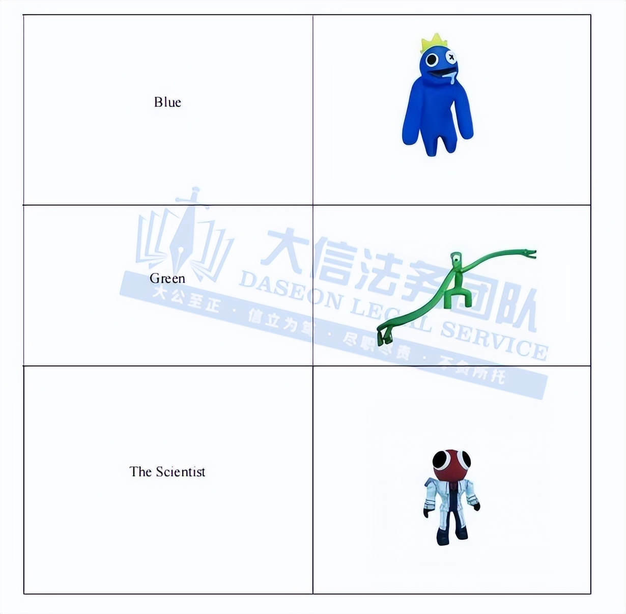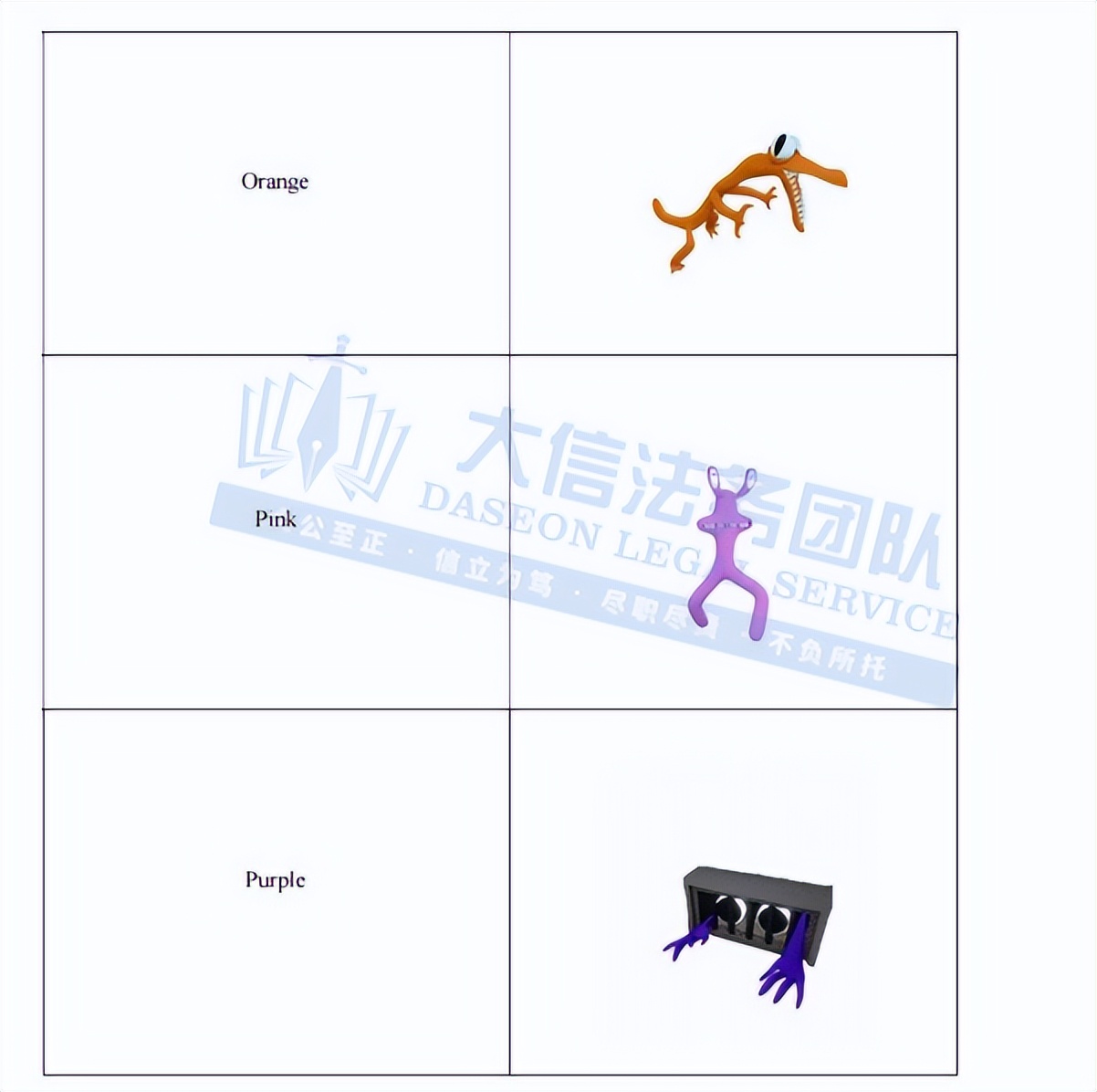 此案为商标+版权维权,商标词:Rainbow Friends,版权角色:Blue(蓝色角色)、Green(绿色角色)、The Scientist(科学家角色)、Orange(橙色角色)、Pink(粉色角色)及Purple(紫色角色),