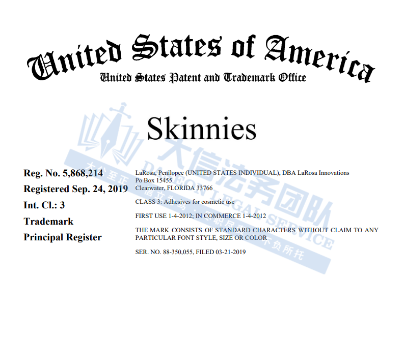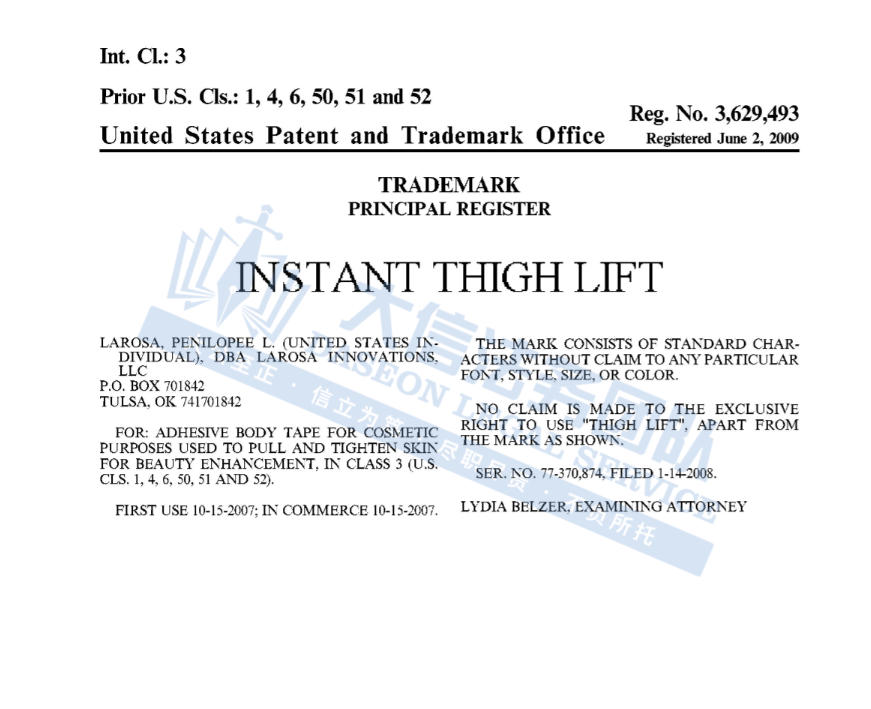 此案为商标维权,涉及3个核心商标,Skinnies:5868214)、Instant Lifts:4267225以及Instant thigh Lift:3629493,以下是涉及商标的具体信息,未经授权不得擅自使用,侵权风险极高,跨境卖家尽快检索下架,避免TRO侵权风险!