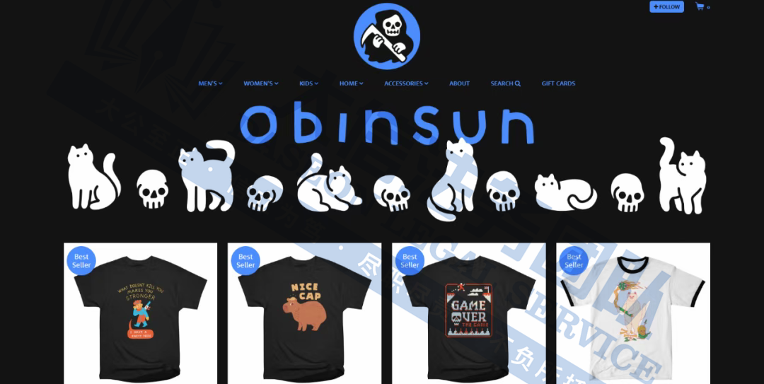 原告是来自科罗拉多州的插画家,擅长在他的作品中加入猫咪、幽灵和死神等元素,使画面充满趣味性。他那诙谐幽默的创作风格,搭配鲜艳明亮的色彩和萌趣的画风,与万圣节的主题相得益彰,洋溢着一种轻松愉快的幽默气息。自2012年底以来,Joel一直在设计以可爱猫咪为中心的T恤。