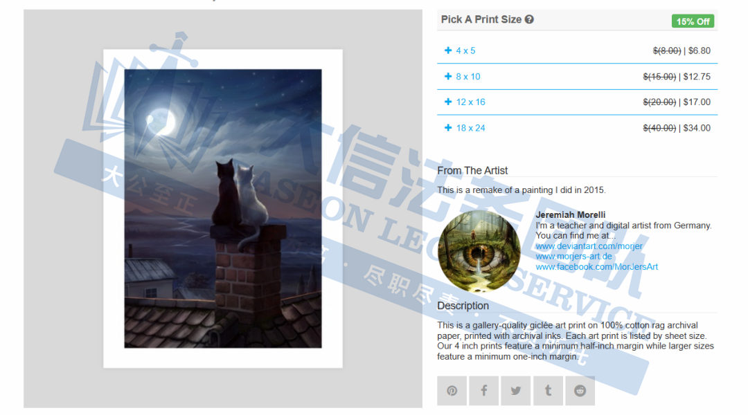 原告是来自密歇根州的专业水彩画家,高中时,他不幸患上了脑瘤。康复过程中,他重新拾起了水彩画创作,并通过自学逐渐成为了一名专业画家。如今,他带着自己的作品活跃在密歇根州各地的艺术展上。他的作品在艺术展览、Etsy平台以及当地礼品店均有销售。