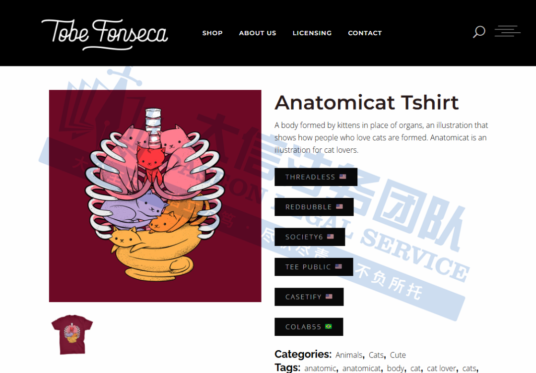 原告是一位巴西插画家与创作者,他擅长用简洁的方式呈现自己喜欢的元素,同时也会尝试创作更复杂的图案,将拼贴与插图融合在一起。他的创作风格将幽默与自然元素相结合,独特且富有创意,他是 Tobias Fonseca 设计工作室的创始人,其作品被广泛应用于 T 恤、贴纸、墙画等多种商品上。