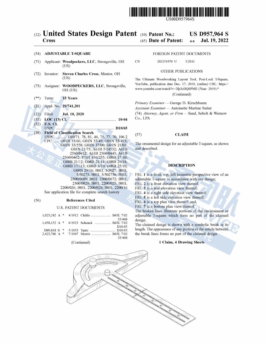 此案为专利+版权维权,目前有50个店铺被冻结,涉及一款Posi-Lock T-Square专利,专利号为:D957964,于2022年7月19日下证,值得注意的是,还涉及一款在2025年7月22日美国下证,版权号为:PAu004269922,以下是涉及具体信息,侵权风险极高,跨境卖家尽快检索下架,避免TRO侵权风险!