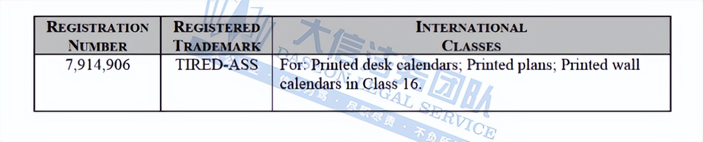 此案为商标维权,涉及商标词:Tired-ass,商标号为:7914906,注册种类在第16大类,涵盖:印刷版台历,印刷版图纸,印刷版挂历等类目,以下是涉及商标的具体信息,未经授权不可擅自使用,侵权风险极高,跨境卖家尽快检索下架,避免造成更大的侵权损失!