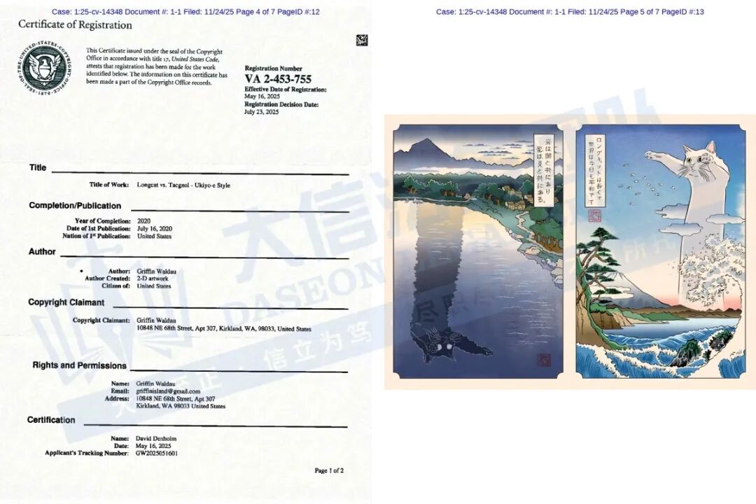 原告Griffin Waldau的创作以奇妙的跨时空对话为核心。他将瞬息万变的互联网文化、病毒式传播的表情包与当代流行符号,巧妙融入浮世绘等日本古典艺术脉络,在赛博空间重构葛饰北斋式的美学宇宙。其作品既是数字时代的文化考古,也是传统美学的当代转译,在二次元与江户时代、虚拟表情与古典笔触的碰撞中,创造出令人会心一笑的艺术新语系。