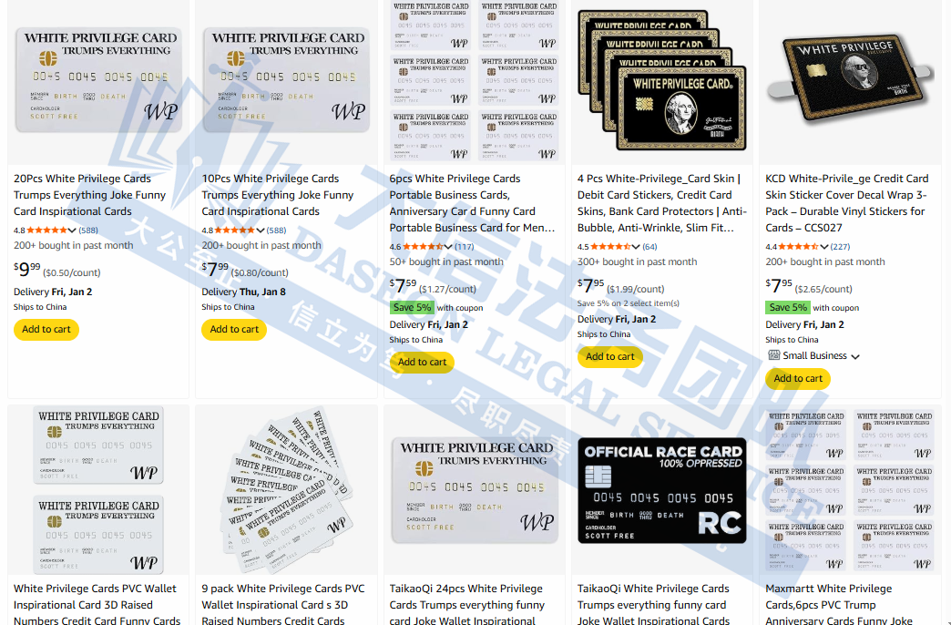 原告来自美国佛罗里达州,White Privilege Card是他设计一种不具有法律或社会效力,仅用于娱乐目的的塑料印刷式新奇标识卡,围绕“白人特权(White Privilege)”这一现实议题展开,通过卡片形式进行表达,从而引发公众对White Privilege白人特权这一社会现象的关注与反思,是一个具有讽刺意味的概念性产物。