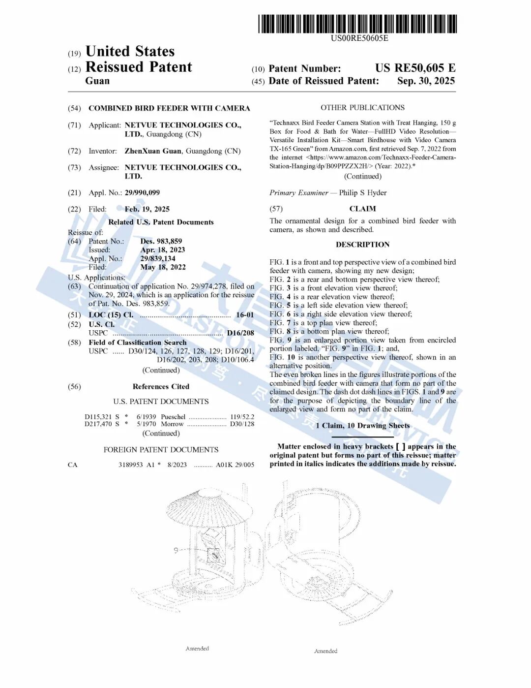 此案为专利维权,目前已有14家店铺被冻,涉及一项带摄像头鸟类喂食器,专利号:RE50605,以下是涉及专利的具体信息,侵权风险极高,跨境卖家尽快检索下架,避免TRO侵权风险!