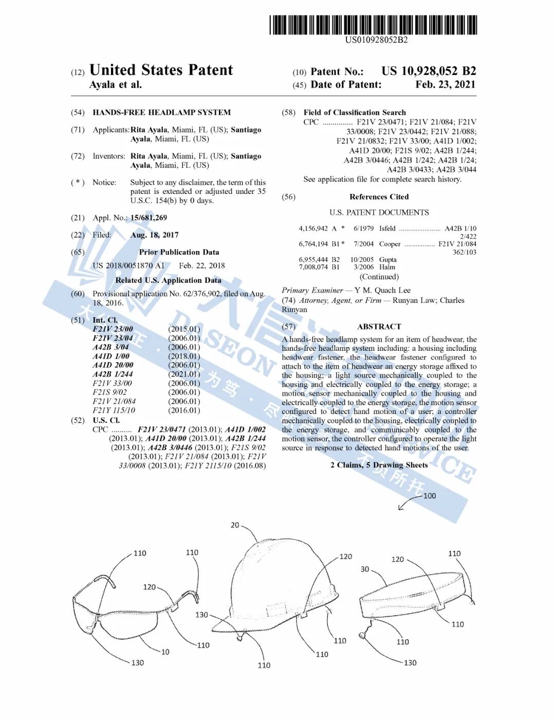 此案为专利维权,涉及一项发明专利,专利号:10928052,专利名称:Hands-free headlamp system(免提前照灯系统),于2021年2月23日下证,注意,只要与该专利的设计里念相似,就会有侵权风险,以下是涉及专利的具体信息,未经授权不得擅自使用,侵权风险极高,跨境卖家尽快检索下架,避免TRO侵权风险!