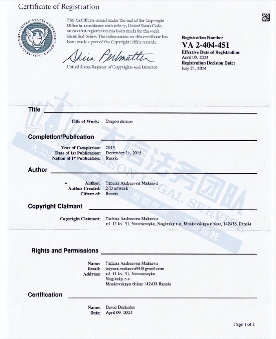 此案涉及一张龙图案的版权维权,版权号为:VA 2-404-451的,创作于2015年,并于2024年7月下证,除此之外原告官网图片未经授权均不可擅自使用,侵权风险极高!跨境卖家尽快检索下架!