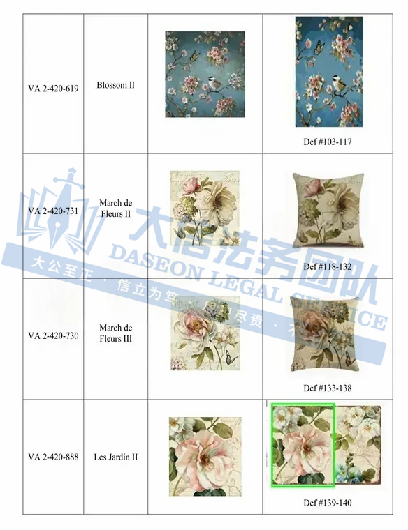 此案为版权维权,涉及3张版权图,版权号为:VA 2-420-560、VA 2-420-556、VA 2-420-532,于2024年9月18日下证,跨境卖家一定要注意检索下架,未经授权不得擅自使用,以下是涉案版权信息,可供卖家参考,避免TRO侵权损失!