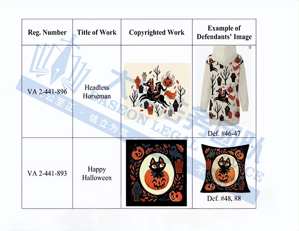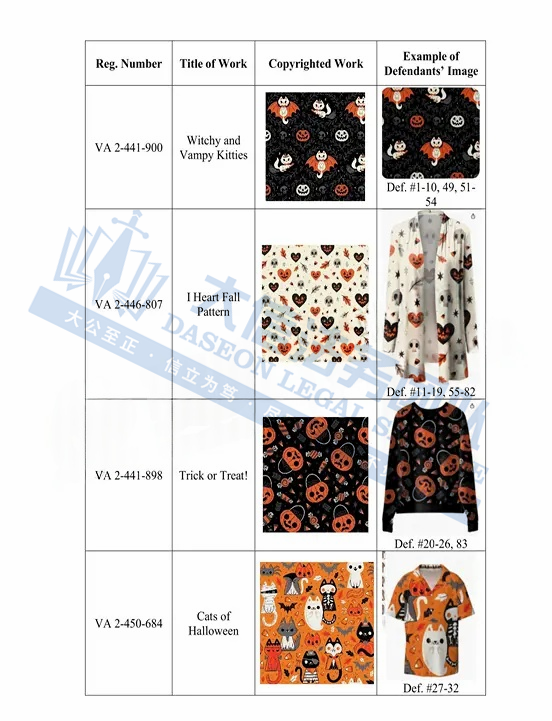 此案为版权维权,涉及9张版权作品,除此之外,官网的其他作品未经授权均不得擅自使用,以下是涉及版权具体信息,侵权风险极高,跨境卖家尽快检索下架,避免造成更大的TRO侵权损失!