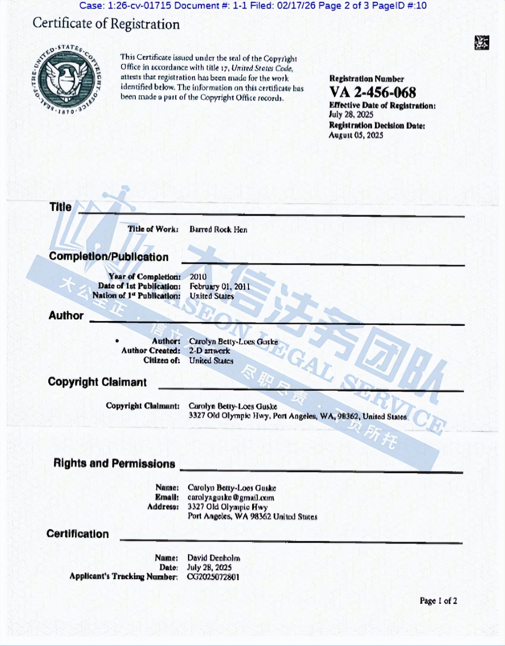 此案为版权维权,目前已有219家店铺被冻,涉及1张母鸡版权作品,并于2025年7月28日下证,除此之外,官网的其他作品未经授权均不得擅自使用,以下是涉及版权具体信息,侵权风险极高,跨境卖家尽快检索下架,避免造成更大的TRO侵权损失!