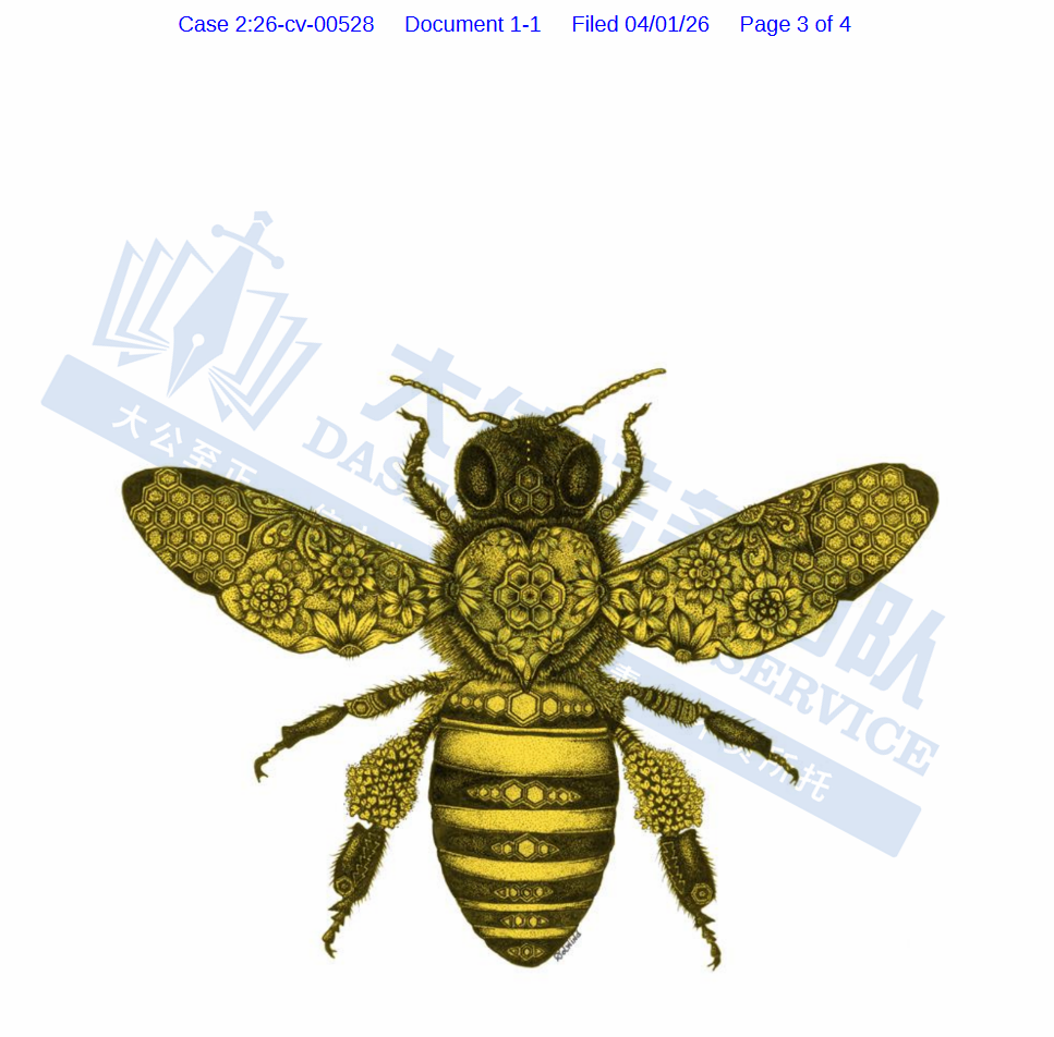 此案为版权侵权,涉及1张版权图Honey Bee,注册号:VA 2-429-529,于24年生效。以下是涉及版权的具体信息,未经授权不得擅自使用,侵权风险极高,跨境卖家尽快检索下架,避免TRO侵权风险!