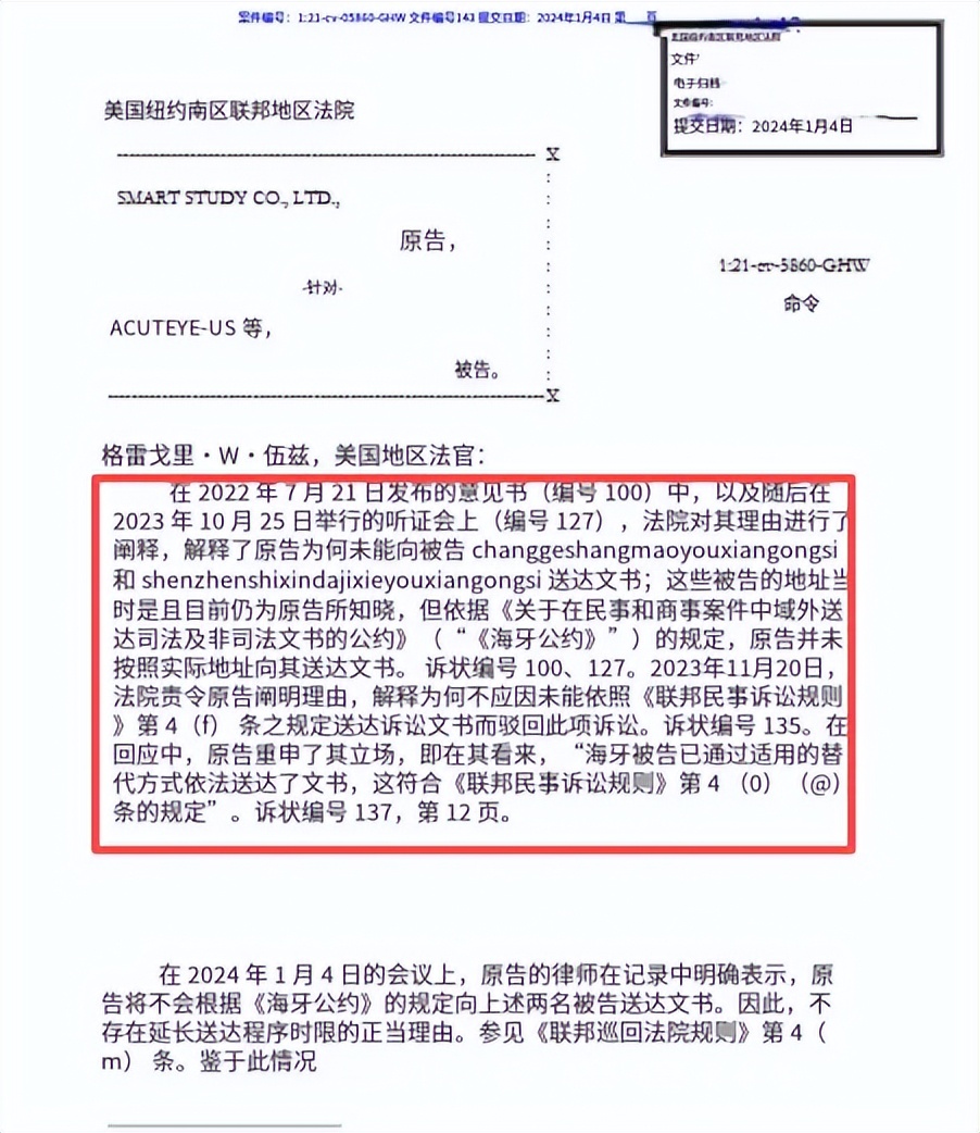 其中两名被告提出抗辩,认为美国法院缺乏属人管辖权,理由是通过电子邮件向中国被告送达违反《海牙送达公约》,也不符合《联邦民事诉讼规则》第4(f)条的规定。