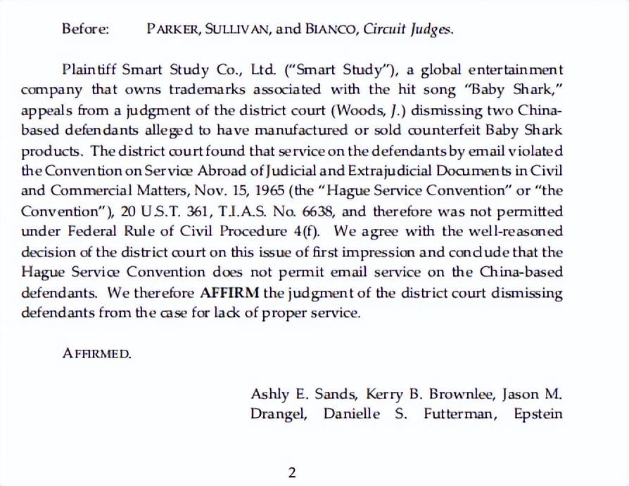 近期,美国联邦第二巡回上诉法院在【Smart Study Co., LTD】鲨鱼宝宝商标维权案做出了一个判决,明确认定:通过电子邮件向中国被告送达法律文书,是违反《海牙送达公约》的,是不合法的!