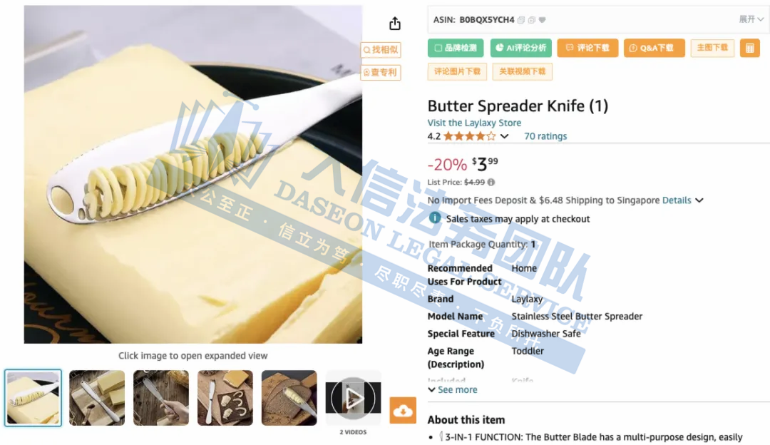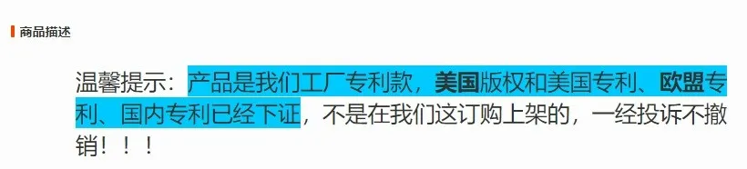 硅胶垫Slap Mat商标维权 案件号:24-cv-07145 立案时间:2024年8月13日 原告:Wham Bam Systems, LLC 代理律所:Saper Law Offices, LLC 原告介绍 原告Wham Bam Systems, LLC是资深发明家、设计师、制造商和3D打印爱好者Peter Solomon在2019年创立,公司专注于3D业务,涵盖3D打印机零件、系统及印刷品等多个领域。Slap Mat硅胶垫是一种由高品质的硅胶材料制成的特殊工作保护垫,这种材料具有张力、柔韧性、优良的绝缘性、耐压、耐高温、耐低温等特性。其设计理念在于简化清理过程,让3D打印变得更加轻松和高效。无论是树脂打印后的清理,还是日常手工制作的保护,SLAP MAT都能提供卓越的防护性能。 官网:https://www.whambamsystems.com/ 案件分析 本案涉及商标Slap Mat维权,注册于第20大类,适用于硅胶垫性质的工作面保护器。原告在8月13日向法院提出TRO禁令,相关卖家注意检索下架,避免侵权损失! 产品展示 02 XBOOM!钥匙扣商标维权 案件号:24-cv-04081 立案时间:2024年5月17日 原告:Jun Fang 代理律所:Zlatkin Cann Entertainment 原告介绍 原告是一位国人卖家,自2020年以来,Jun Fang一直从事设计与销售各种带有XBOOM!商标设计的护身符和钥匙链相关的产品。这款XBOOM!斗牛犬钥匙扣,新潮的设计元素让它成为了一款跨境网红钥匙扣。无论是自用还是送礼,XBOOM!钥匙扣都是不可多得的选择。 案件分析 本案涉及商标“XBOOM!”维权,已确认涉及137家侵权店铺,即将面临TRO冻结措施。相关产品的卖家,提高警惕,避免陷入侵权纠纷! 产品展示 03 Butter Knife 黄油刀专利维权 案件号:24-cv-07631 立案时间:2024年8月23日 原告:Hongying Wang 代理律所:Lance Liu 原告介绍 原告Hongying Wang是一家来自中国的卖家,是BUTTER KNIFE黄油刀的制造商和经销商,以其卓越的耐用性和精巧的设计而闻名。采用最优质的不锈钢材质,这款黄油刀不仅经久耐用,更具备出色的耐腐蚀性能,确保每一次的使用都能如初见般光亮如新。无论是涂抹黄油、果酱还是奶油,都能轻松均匀。 案件分析 此案涉及外观专利维权,该专利于2016年下证,最初的发明人和申请人均为外国人,后来专利被转让给了一位国内卖家,并由其发起了诉讼。即使产品不是一模一样,设计理念相同也会有侵权风险!相关卖家注意检索下架! 产品展示 04 硅胶面包发酵篮版权维权 案件号:24-cv-07437 立案时间:2024年8月19日 原告:Shenzhen Pujing Silicone Products Co., LTD 代理律所:Stratum Law LLC 原告介绍 原告是来自深圳的国人卖家,专注于生产硅胶制品、硅胶厨具、硅胶宠物用品等产品。这款硅胶面包发酵篮耐高温、易清洁,配有两个不同尺寸的发酵篮,非常适合烘焙爱好者使用。 案件分析 此案涉及版权维权,美国版权VAu1-514-390。原告在其官店的描述页中声明其产品是工厂专利款,拥有美国版权及专利,欧盟和国内专利也已下证。并称如非从原告方订购,一经投诉将不撤诉。 产品展示 今天就分享到这里了,感谢你的阅读。大信团队会持续为你带来最新的侵权咨询。想要了解更多内容,可关注我们【大信团队】。 如果有关于店铺大额资金冻结、同行解决不了、缺席判决、多次谈判博弈无法和解的案子可以添加我们联系方式,我们将为你提供最优质的法律服务。 我们始终坚信,法律服务没有捷径,容不得任何滥竽充数的行为。大信法务团队有中美资深律师,在美国TRO诉讼行业深耕多年,处理过上万起TRO侵权案,致力于为中国跨境电商卖家保驾护航!