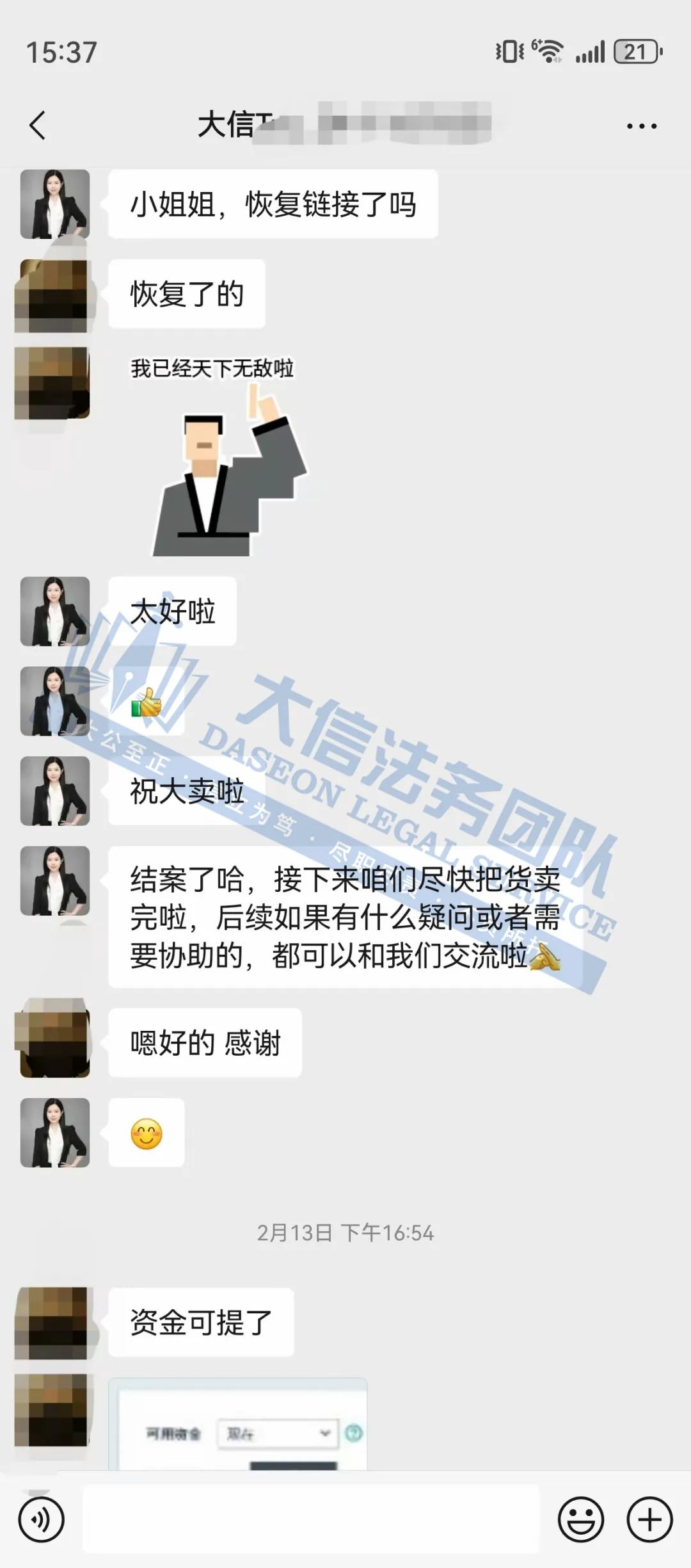 如果有关于店铺大额资金冻结、同行解决不了、缺席判决、多次谈判博弈无法和解的案子可以添加我们联系方式,我们将为你提供最优质的法律服务。