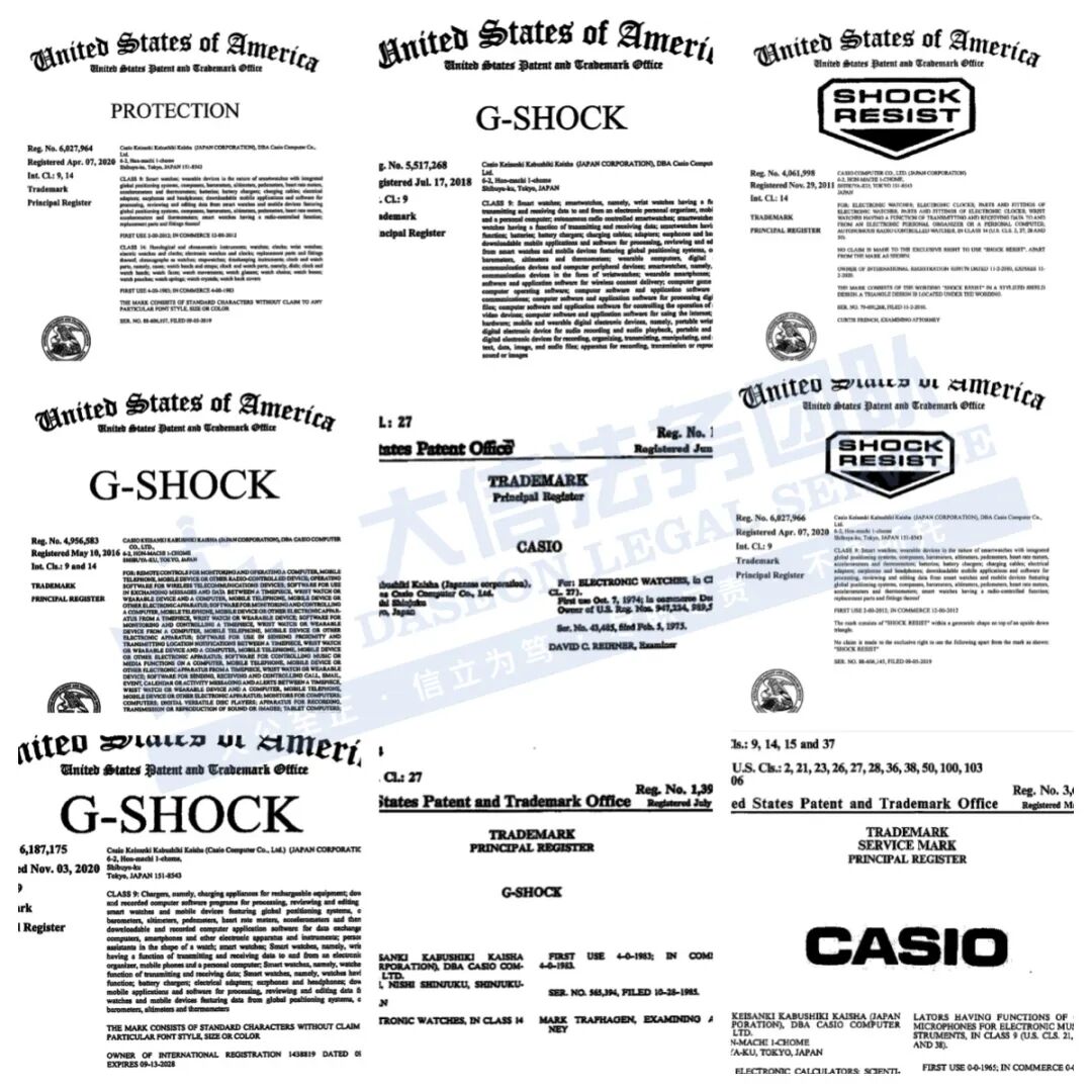 此案为专利+商标维权,专利号:D619909、D658081、 D663222等,商标关键词:CASIO、G-SHOCK、PROTECTION等,侵权风险极高!以下是维权具体信息,未经授权不得擅自使用,跨境卖家尽快检索下架,否则会有TRO侵权风险!