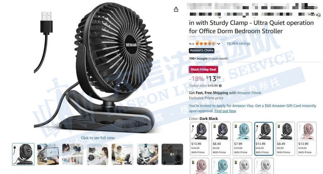 原告主营暖手宝、小型风扇、充电宝等产品的国人企业。其专利涉及一种带有易于组装的夹紧装置的风扇,结构包括风扇主体、支撑框架及夹紧装置。