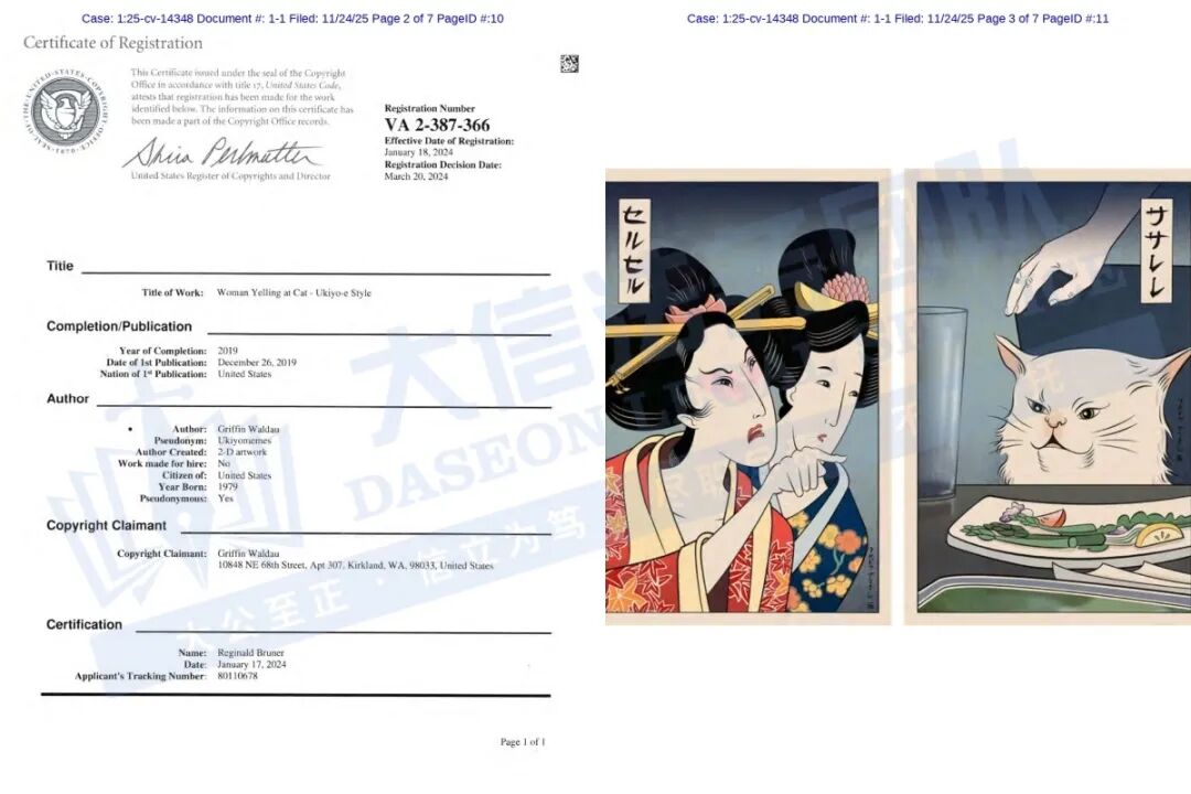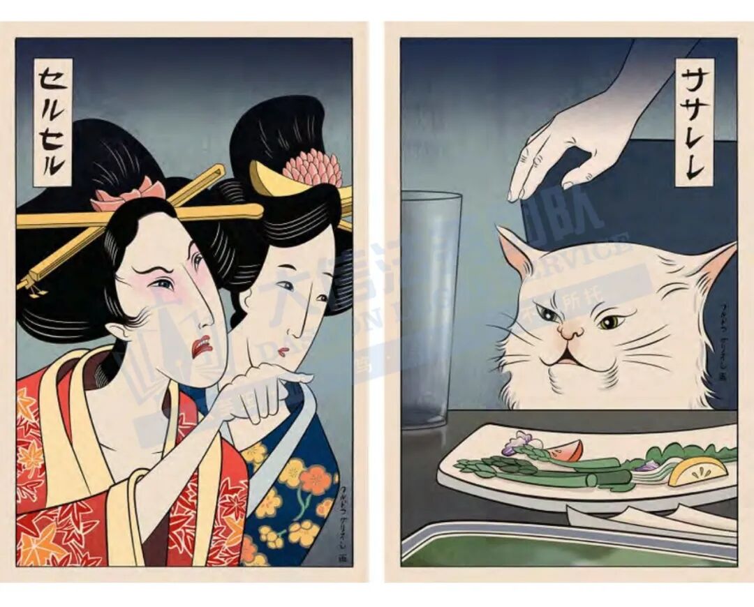 原告Griffin Waldau的创作以奇妙的跨时空对话为核心。他将瞬息万变的互联网文化、病毒式传播的表情包与当代流行符号,巧妙融入浮世绘等日本古典艺术脉络,在赛博空间重构葛饰北斋式的美学宇宙。其作品既是数字时代的文化考古,也是传统美学的当代转译,在二次元与江户时代、虚拟表情与古典笔触的碰撞中,创造出令人会心一笑的艺术新语系。