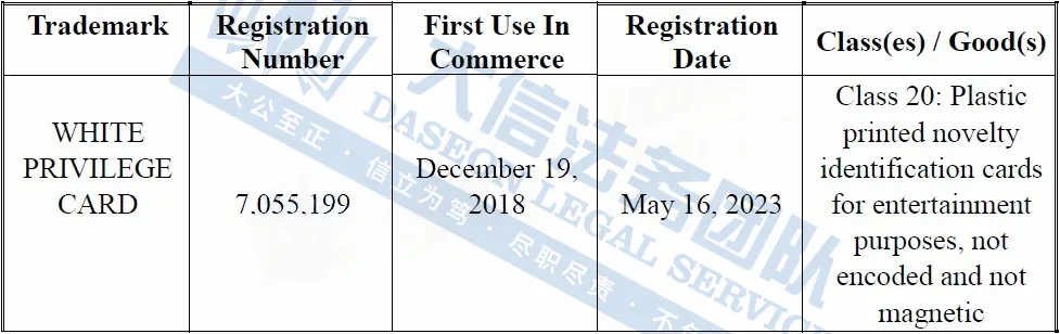 原告来自美国佛罗里达州,White Privilege Card是他设计一种不具有法律或社会效力,仅用于娱乐目的的塑料印刷式新奇标识卡,围绕“白人特权(White Privilege)”这一现实议题展开,通过卡片形式进行表达,从而引发公众对White Privilege白人特权这一社会现象的关注与反思,是一个具有讽刺意味的概念性产物。