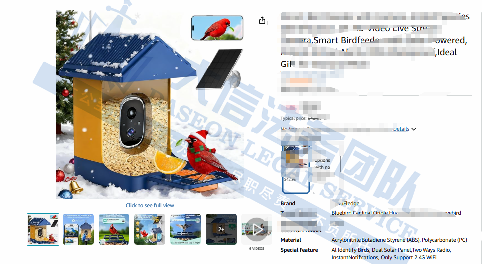 此案为专利维权,目前已有14家店铺被冻,涉及一项带摄像头鸟类喂食器,专利号:RE50605,以下是涉及专利的具体信息,侵权风险极高,跨境卖家尽快检索下架,避免TRO侵权风险!