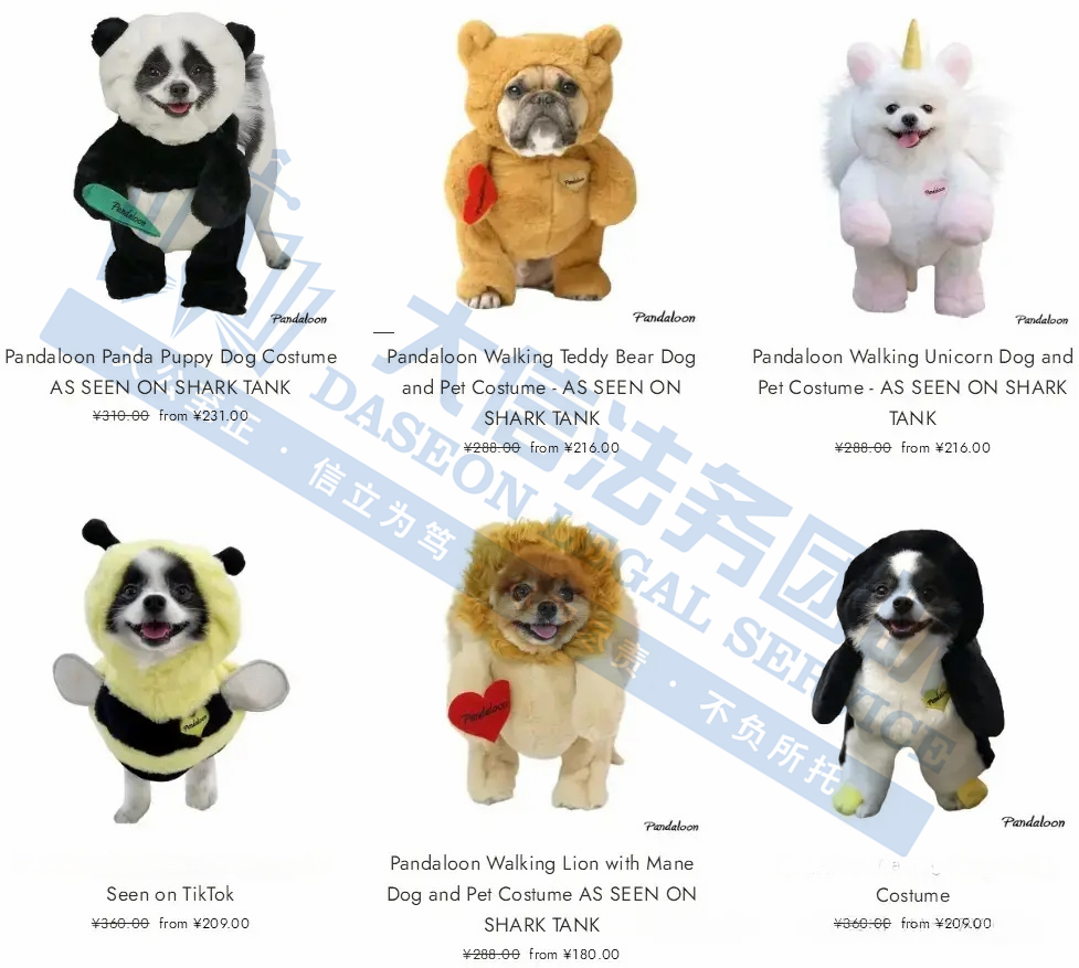 原告是来自美国一家创意宠物服装公司,注于为宠物设计独特服饰,可将宠物装扮成泰迪熊、兔子、独角兽等可爱的“行走萌物”。其产品配备可调节抽绳,适配小型至中型犬及猫等宠物,兼顾舒适性与趣味性,且设计贴合宠物身形,能有效提升宠物的接受度。