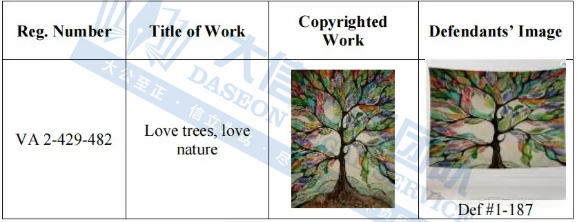 此案为版权维权,目前已有116家店铺被冻,涉及19张版权图,以下是涉及版权的具体信息,除此之外,官网上的其他作品未经授权不得擅自使用,侵权风险极高,跨境卖家尽快检索下架,避免TRO侵权风险!