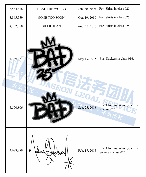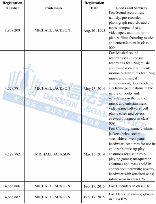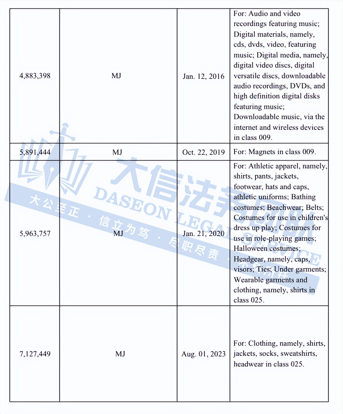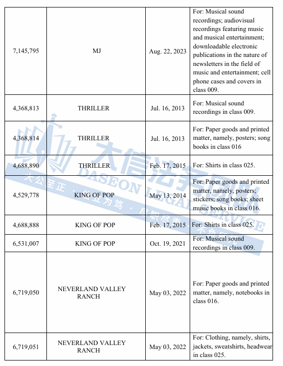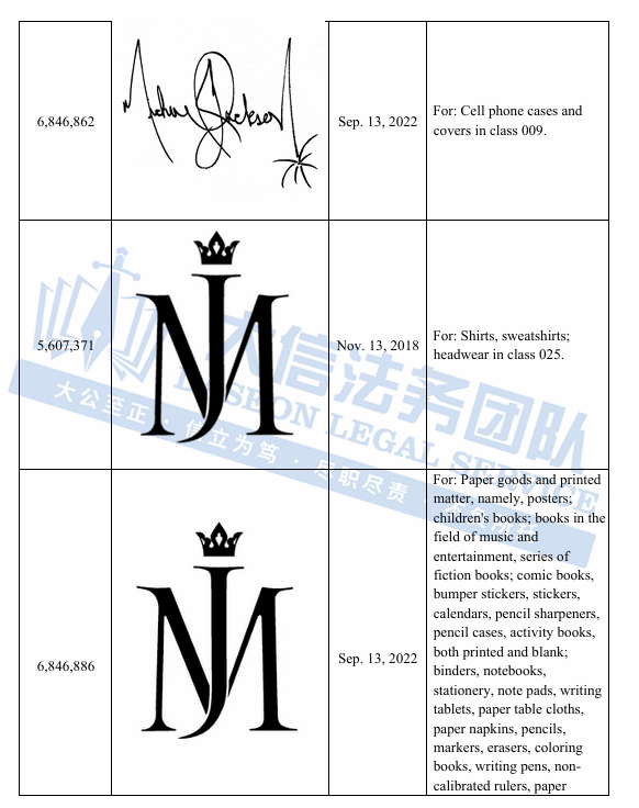 此案为商标维权,注册超多商标,包含但不限于:MICHAEL JACKSON、MJ、THRILLER、KING OF POP等,以下是商标信息,跨境卖家尽快检索下架,未经授权不能随意使用,侵权风险极高!