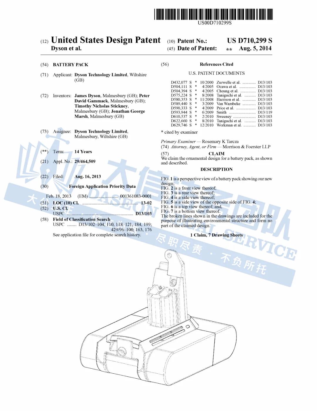此案为专利维权,涉及一项外观专利,专利号:USD710299S,“BATTERY PACK”(电池组),该专利于2013年8月16日申请,2014年8月5日下证,主要保护的是电池组的装饰性设计,注意,只要和该专利外观相似的都有侵权风险,以下是涉及专利的具体信息,未经授权不得擅自使用,侵权风险极高,跨境卖家尽快检索下架,避免TRO侵权风险!