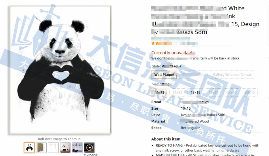 此案为版权维权,目前已有34家店铺被冻,涉及8张版权作品,除此之外,官网上的图片均不可擅自使用,以下是涉及版权的具体信息,未经授权不得擅自使用,侵权风险极高,跨境卖家尽快检索下架,避免TRO侵权风险!