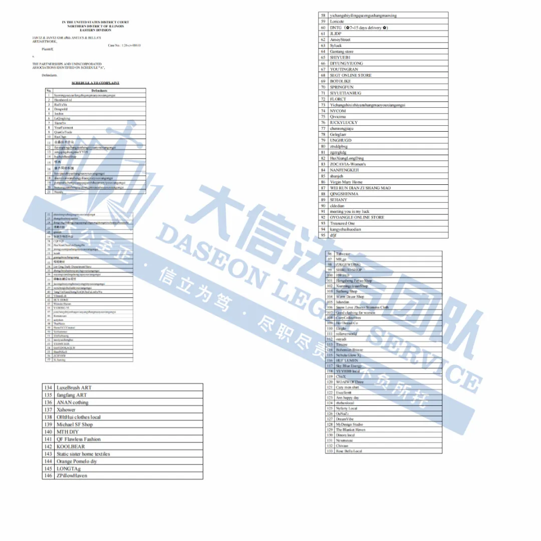 此案为版权维权,目前已有287家店铺被冻,涉及24张版权作品,除此之外,官网上的图片均不可擅自使用,以下是涉及版权的具体信息,未经授权不得擅自使用,侵权风险极高,跨境卖家尽快检索下架,避免TRO侵权风险!